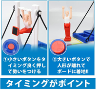 ・回転ボタンをリズムよくプッシュして鉄棒選手をスイングさせます。